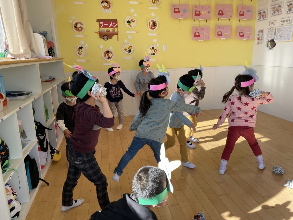 以上児は新聞紙で豆を作りました。
