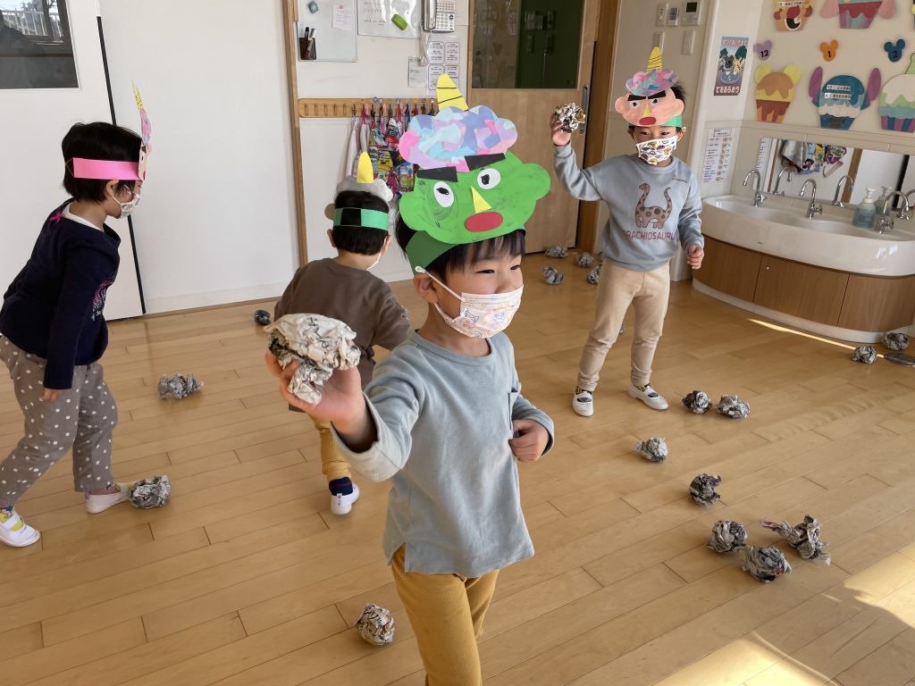 泣かずにしっかり豆を投げてます。
