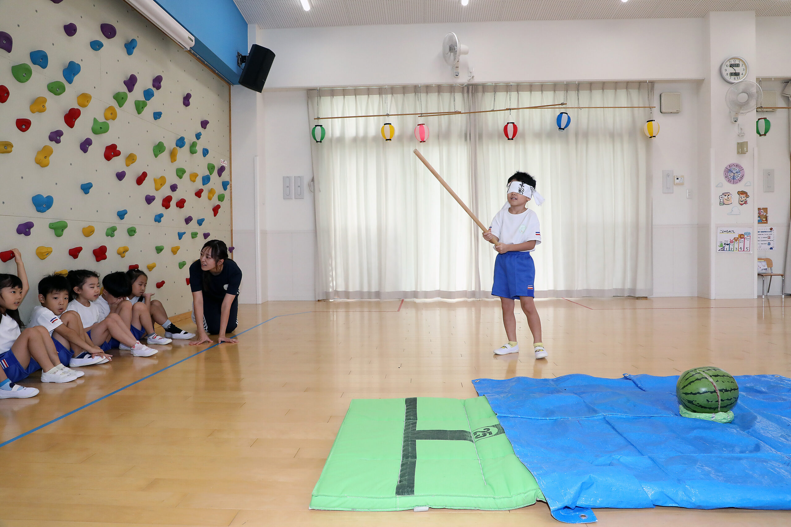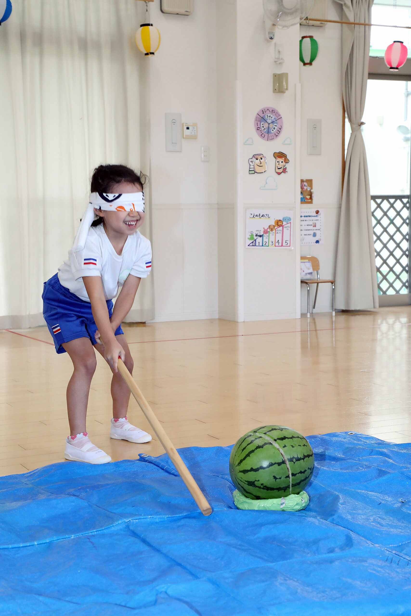 第1部(午前中)は、先生と子どもたちでダンスをしたりスイカ割りや魚釣りをして楽しみました。
