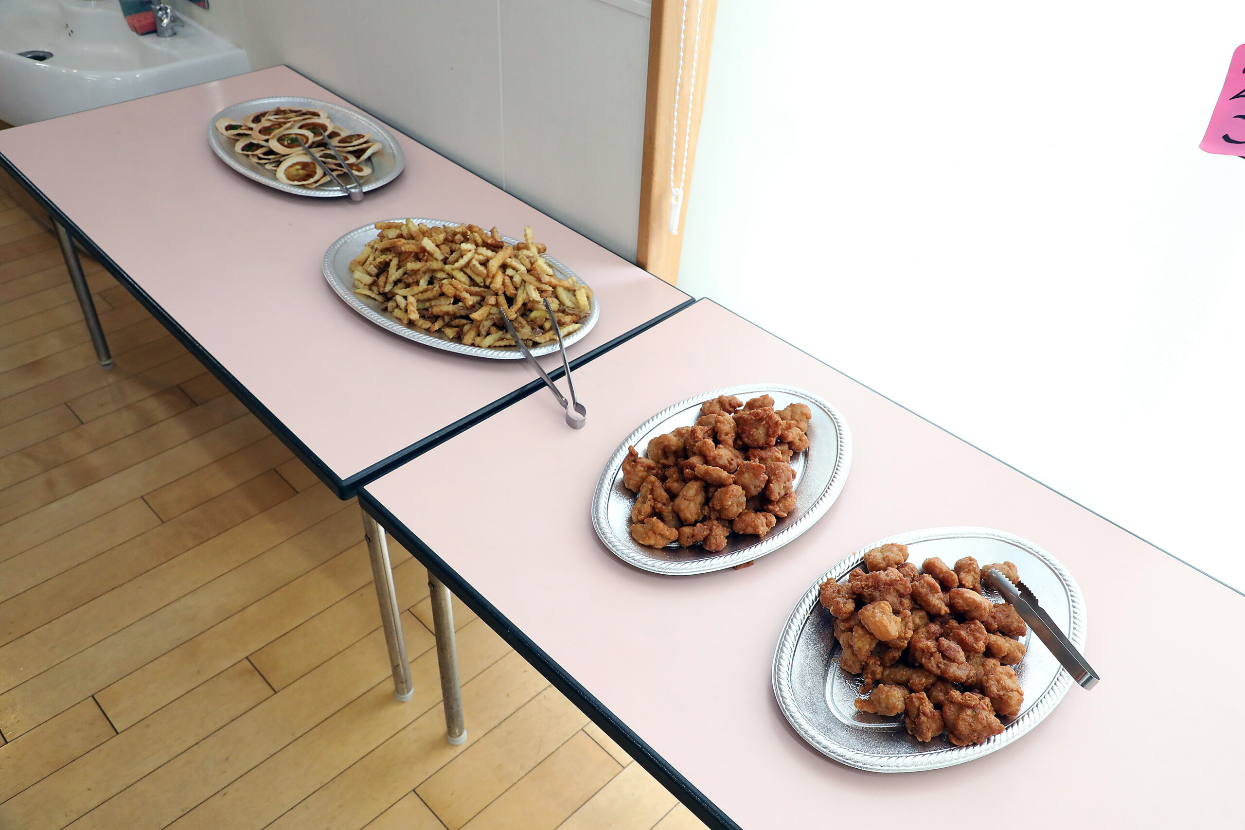 焼きそば・ミニお好み焼き・唐揚げ・フライドポテト・ボイル野菜・フルーツポンチ