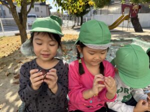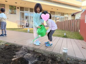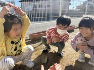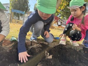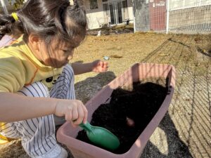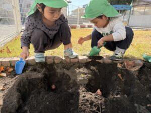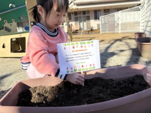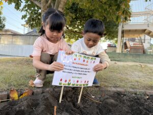 種の正体を知ったみどりぐみさんは、1人ずつチューリップの球根を植えることにしました!
