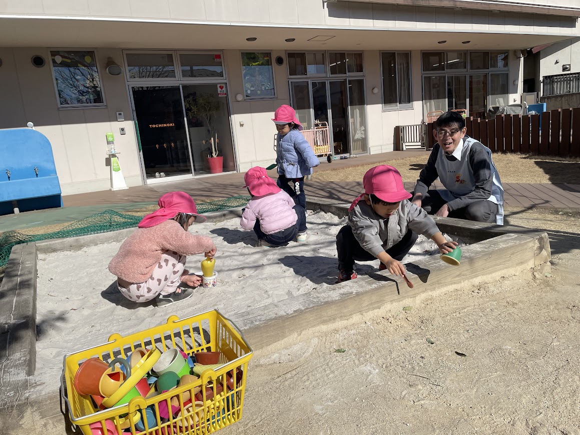 ポカポカ陽気の中、子どもたちと一緒に砂遊びをしてくれました。