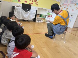 次は絵本の読み聞かせ!みんなが好きなザリガニの絵本は興味津々!